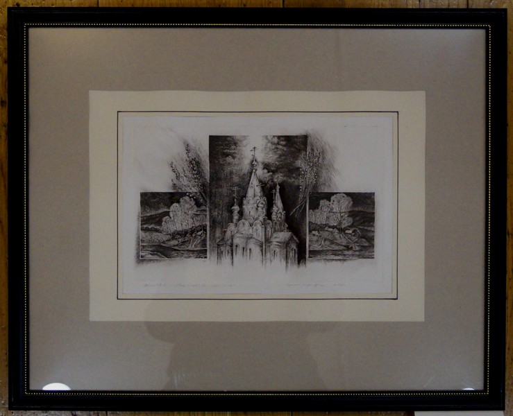 Офортная доска и графический лист «Вербное воскресенье» созданы автором в 2004 г. В этой работе, используя символы русской культуры – православный храм (собор Благовещения Пресвятой Богородицы в Благовещенске), характерный русский пейзаж, художник демонстрирует свою принадлежность к России, родине, национальным традициям. Образный композиционный и графический язык, особая трактовка деталей и манера штриха отличают работы А.А.Тахаева.